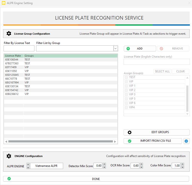 Edit Groupsbutton to start creating and managing groups (e.g., Employees, Visitors, Blacklisted, VIP) - After creating groups, you can now assign the license plates to one or more groups.