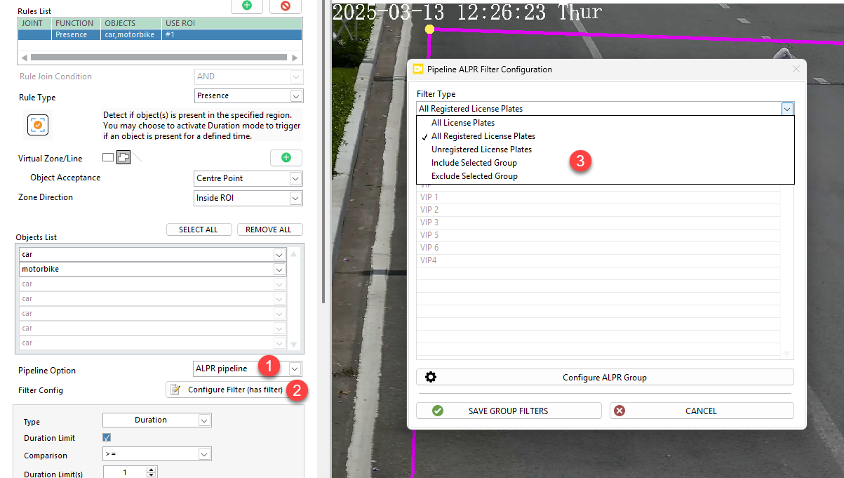 - Group Filters: Include or exclude specific groups (e.g., detect only Blacklisted vehicles).