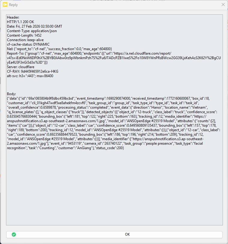 The HTTP Event Action allows ANSVIS to send AI task event data to an external system via an HTTP POST request. This action is configured per AI task and is triggered automatically when the AI task generates an event (e.g., detection, counting, recognition, etc.).